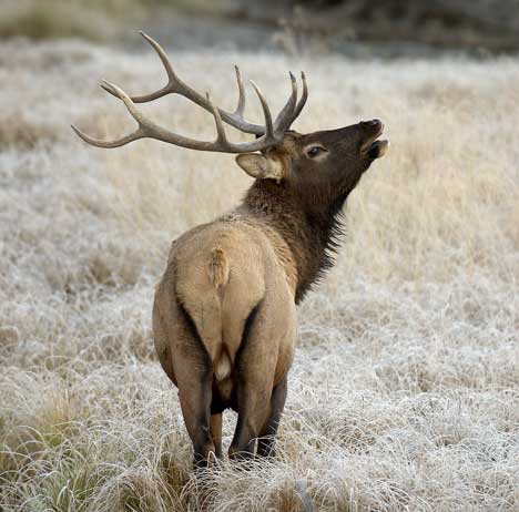 Though daytime temperatures reached into the low 60’s, early morning’s were below freezing. Just after dawn, nearFishing Bridge, we spied this bull Elk grazing in a field covered in hoar frost.