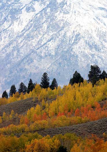 Long lens perspective compression and isolation through the use of telephoto lenses is one of my favourite techniques. Here the juxtaposition of the brilliant Fall foliage on the foreground hillside with the mostly barren snow-covered mountain behind tells something about the natural beauty of this remarkable region of the American Rocky Mountains.