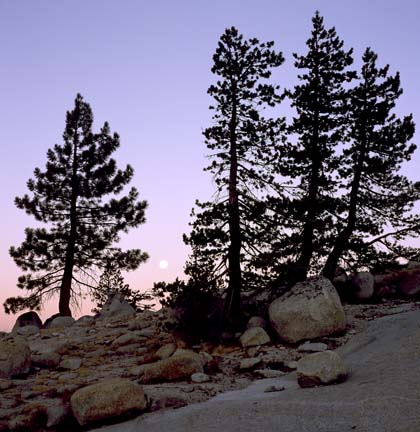 Look closely and you’ll see the setting moon between the trees. Just moments before the two pictures above were taken, as we were climbing the rocky slope to frame the shots we spotted the moon over this rise. There were just seconds to capture it.